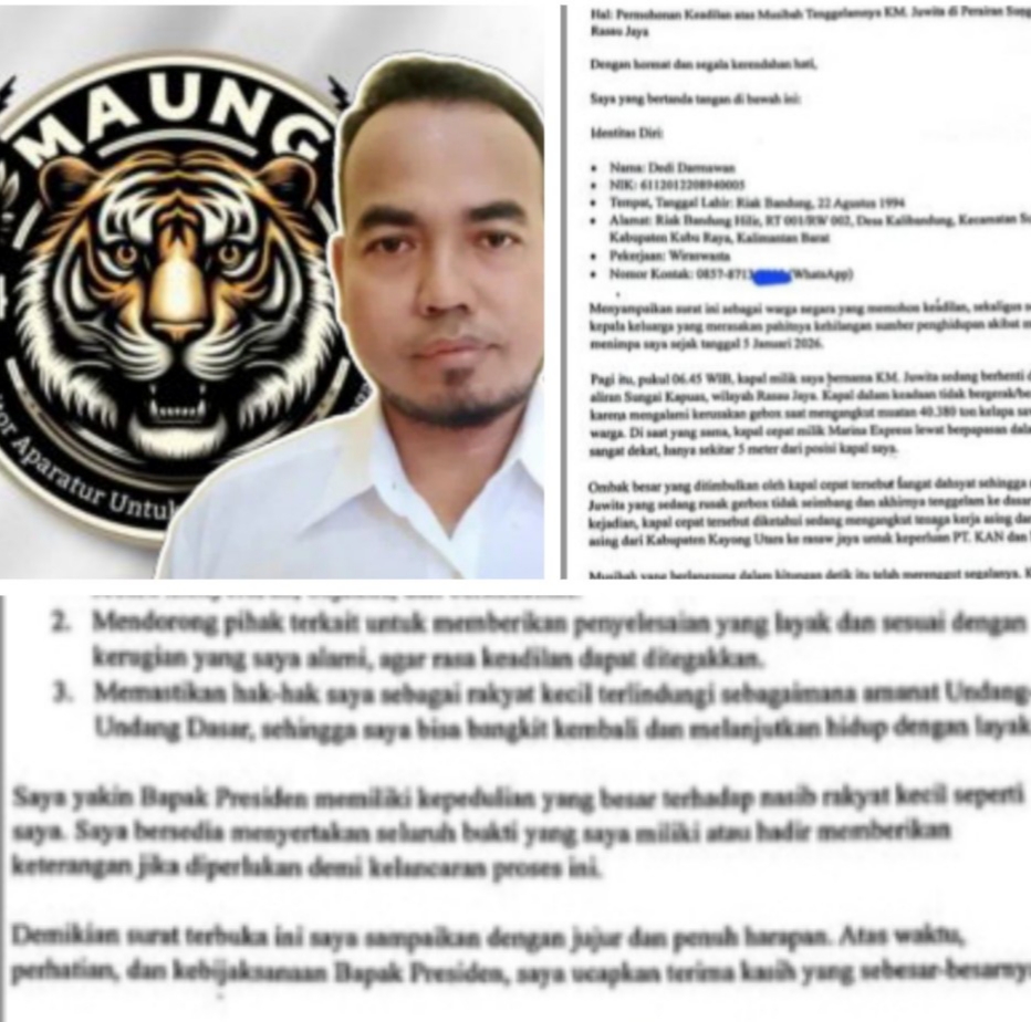 “Ini Sangat Memilukan! Jangan Ada Diskriminasi Hukum. Kami dari LSM MAUNG Kalbar sangat prihatin dan menyoroti kasus yang menimpa saudara Dedi Darmawan ini. Sungguh sangat memilukan melihat nasib rakyat kecil yang diperlakukan tidak adil. Kapal itu adalah nyawa dan satu-satunya sumber penghidupan keluarganya, namun ketika hancur karena kesalahan pihak lain, justru penyelesaiannya berjalan sangat lambat dan terkesan dipersulit” Tegasnya Rabu (15/04/26).